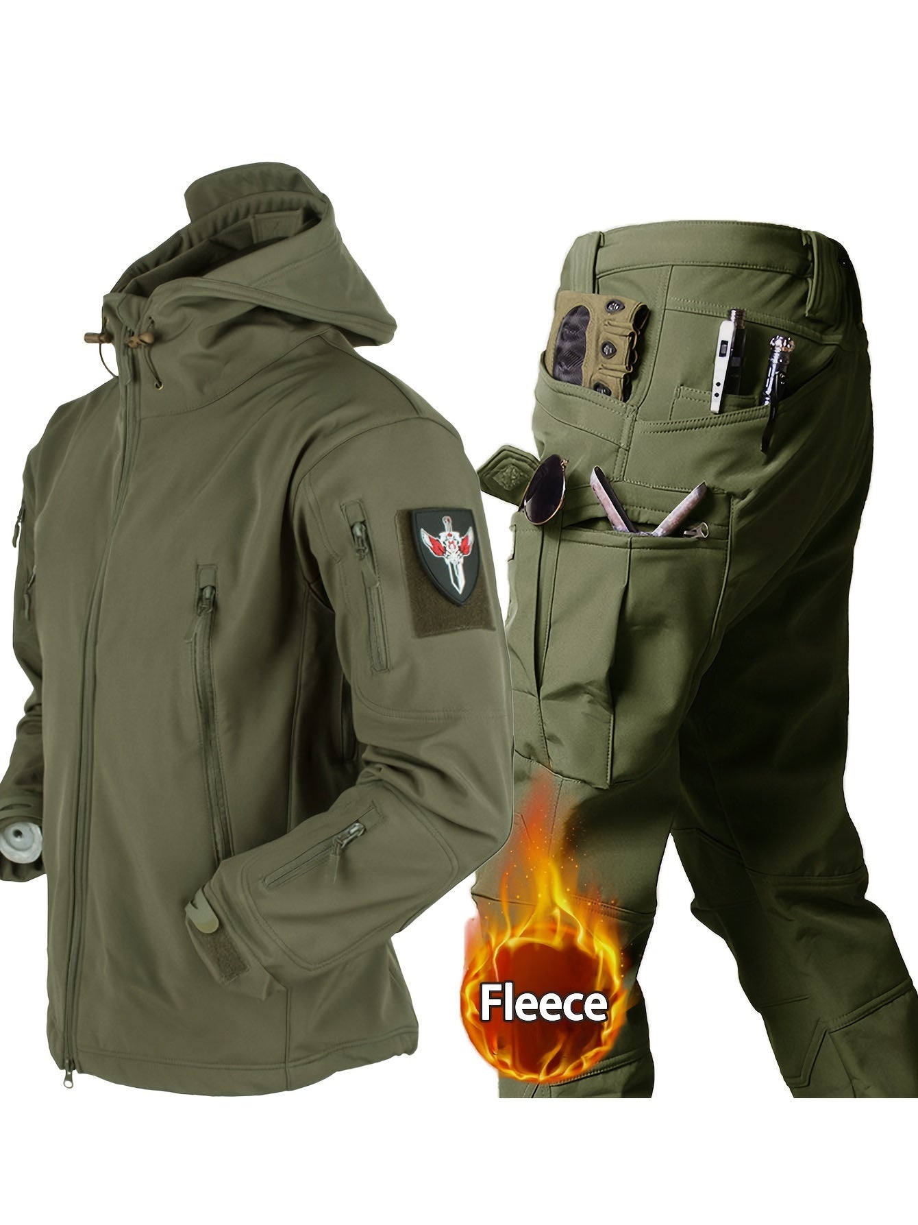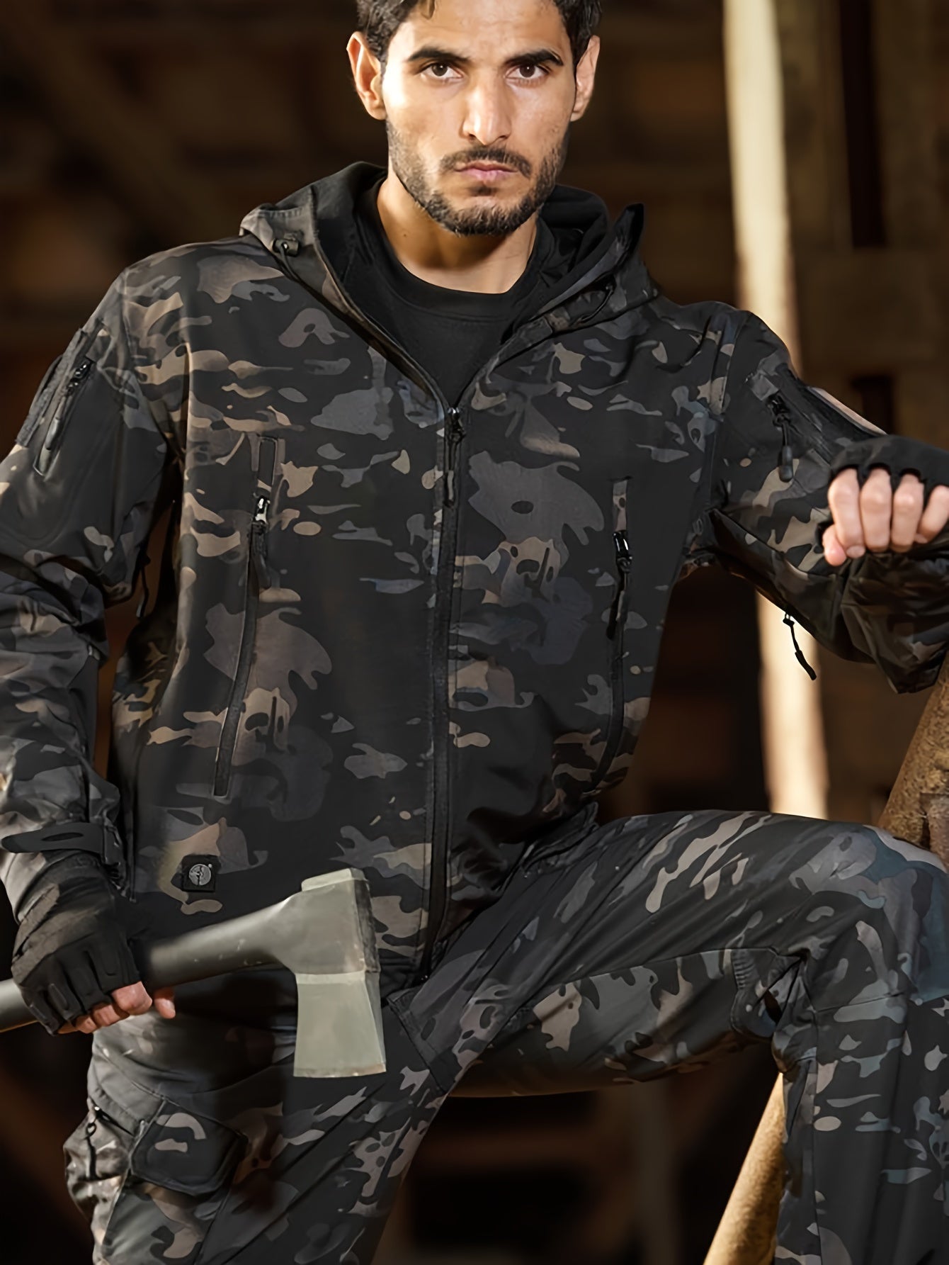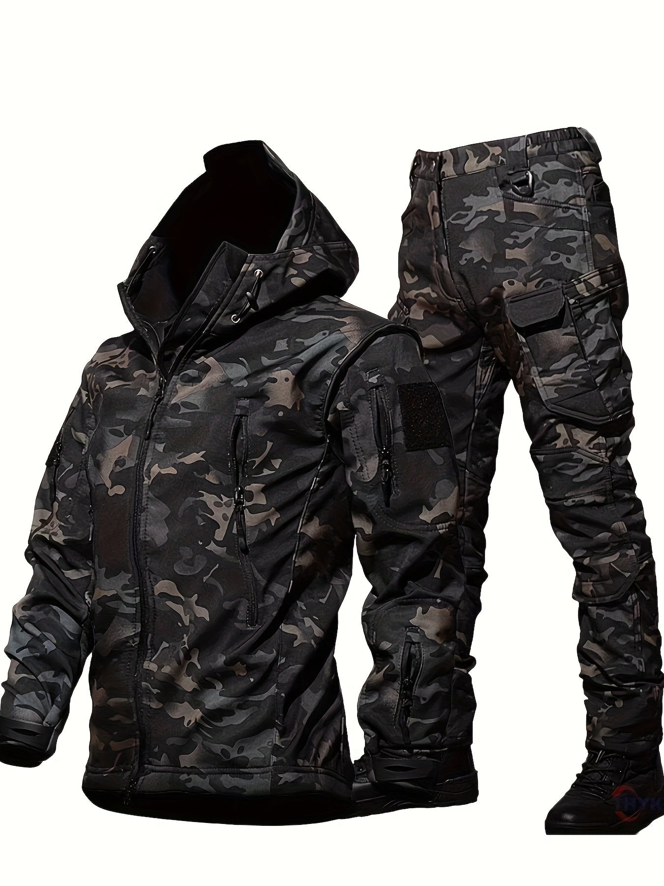 Camouflage Print & Plain Color Men's 2pcs Military Outdoor Windproof Suit Multi-Pocket Soft Shell Hooded Jackets +Sharkskin Work Cargo Pants, Outdoor Cloth